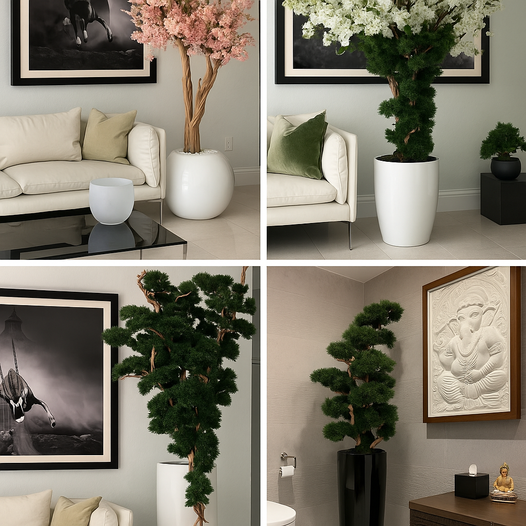 We use high-quality artificial foliage with natural-touch leaves and realistic trunks.
